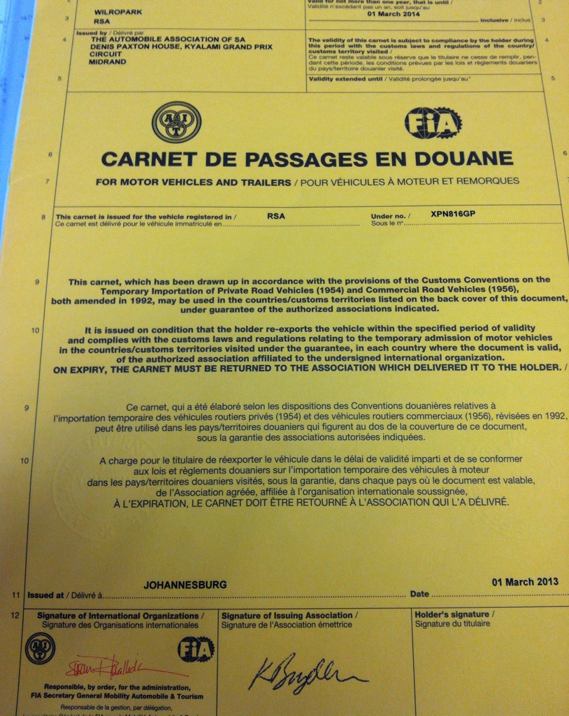 During the week Odette at AASA advised me that my Carnet de Passage is ready for collection. Its that one piece of paper that you always tend to forget in your budget and when you pay that lump sum over you get a kind of nervous feeling and a thought that says ” O shit, I hope I have enough money for this trip”.