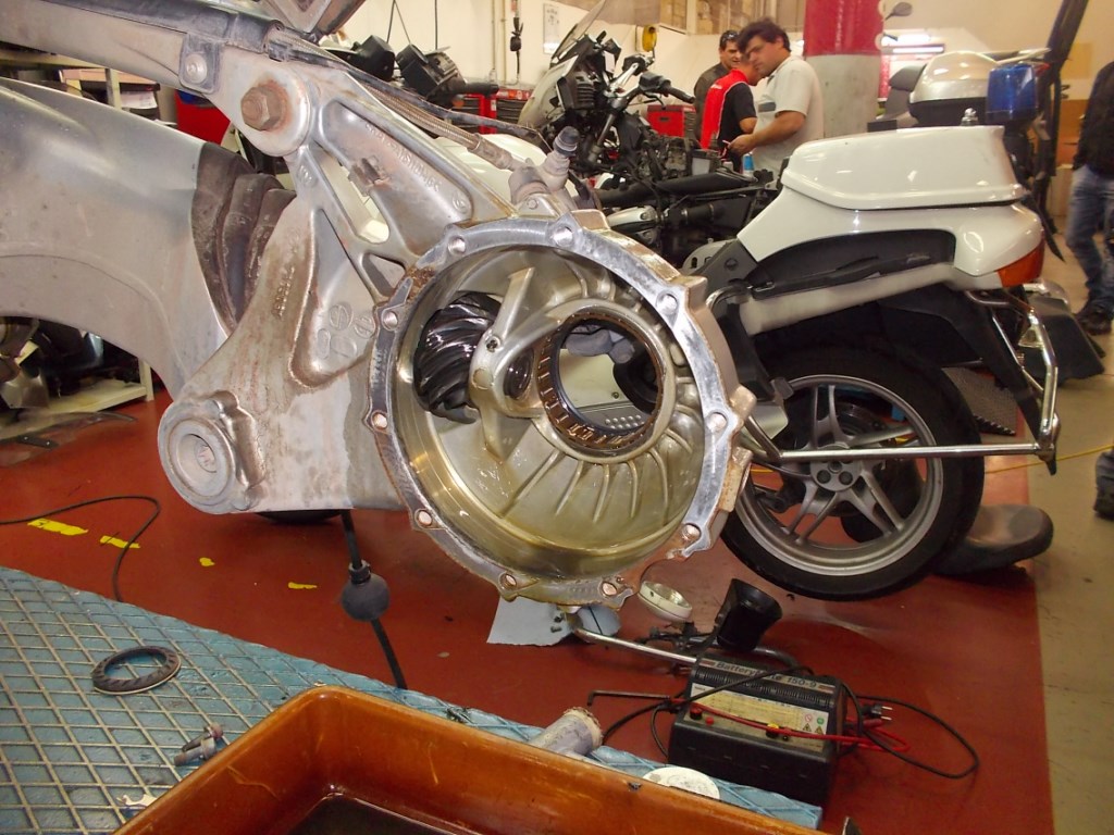 It safe to say that he is a pro! He had the old bearing out in no time, oil drained and started cleaning up the corrosion and dirt from the final drive parts. He saw that I was quite ready to tackle a job and make myself handy so he gave me the difficult task of heating up the hubb so that we could insert the new bearing. So armed with a heat gun I started the heating process. It was quite hard as I had to sit and blow the heat gun onto the piece of metal for 15min. Yes, I am quite technical and handy with heating stuff in the workshop. So with me out of the way Francisco went on finishing the work on my bike.