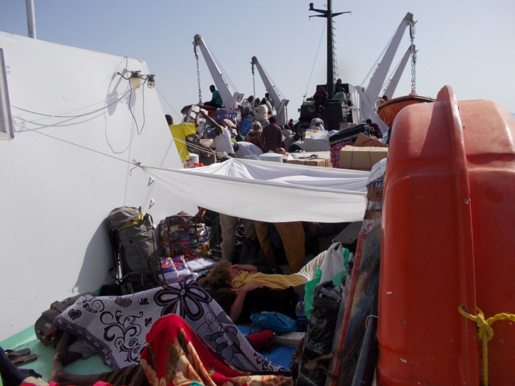 The deck space was not existent. The only way to get to the otherside was to walk over people and their stuff. I must have walked 30 meters without touching the steel deck once. It was going to be a long trip.